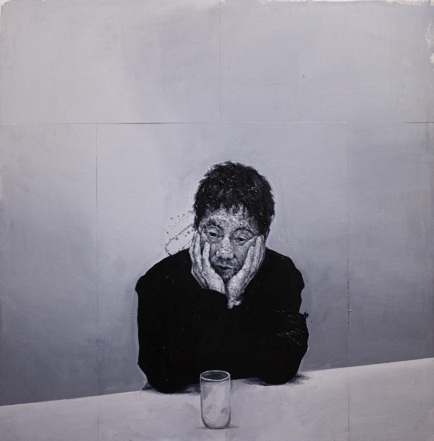 La obra se construye en blanco y negro, jugando con matices dentro de la monocromía. La textura es protagonista: fragmentos de pared del estudio, óleo, carbonato cálcico y hasta ramas secas manchadas en tinta que golpearon la superficie para dejar huella. Es un proceso entre lo controlado y lo azaroso, entre la precisión del retrato y la espontaneidad del gesto.